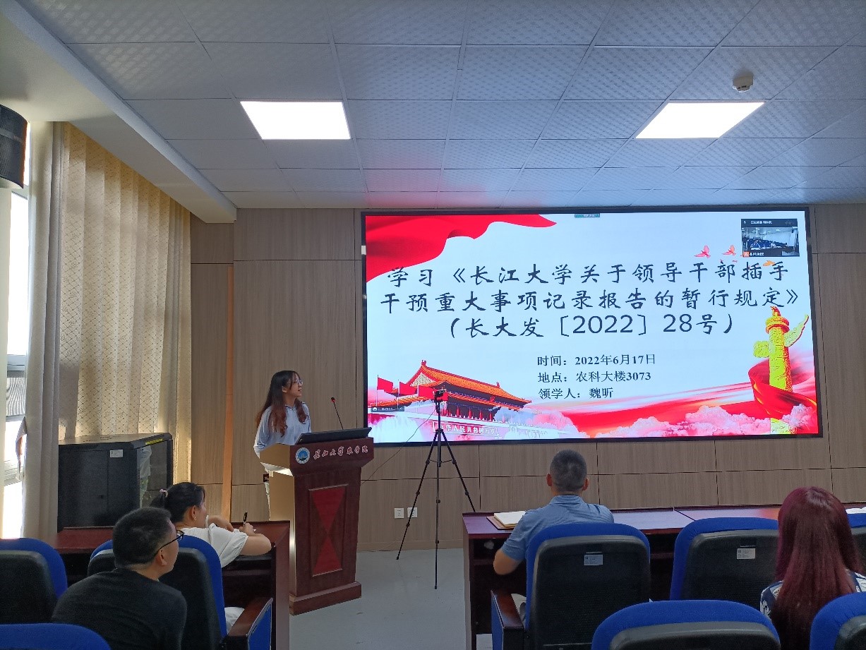 会议伊始,组织委员时锦超同志带领全体党员重温入党誓词。紧接着,肖永欣同志对本月党费交纳情况进行了说明。随后,与会党员集体诵读党章第六章,并集体观看视频《习近平回信勉励南京大学留学归国青年学者在坚持立德树人推动科技自立自强上再创佳绩在坚定文化自信讲好中国故事上争做表率》。接着,分别由时锦超同志带领学习《中共长江大学委员会关于开展党员干部下基层察民情解民忧暖民心实践活动的实施方案》;杨阳同志带领学习教育部关于建立健全高校师德建设长效机制的意见;魏昕同志带领学习《长江大学关于领导干部插手干预重大事项记录报告的暂行规定》。方小伟同志为大家讲述党史故事——英烈陈香波。陈香波革命烈士让我们看到了共产党员的崇高信仰和追求,作为研究生党员,我们要深入学习他的敢于斗争、无私奉献的精神,用实际行动诠释自己的初心和使命。
