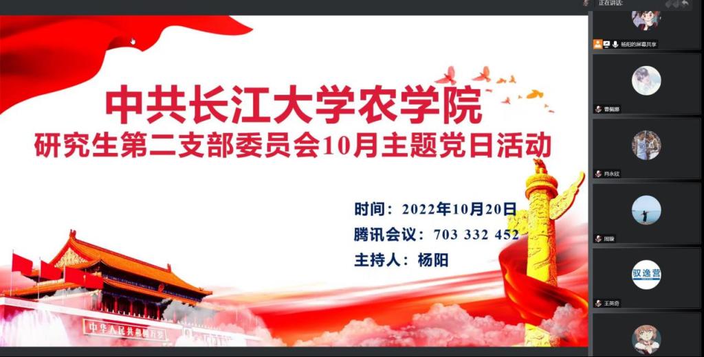 (通讯员 曹佩娜 宋梦圆)10月20日晚7点,我院研究生第二党支部通过腾讯会议在线上开展了十月主题党日活动暨支委换届选举。党支部书记付雪娇以及全体党员参与,会议由支部副书记杨阳同志主持。