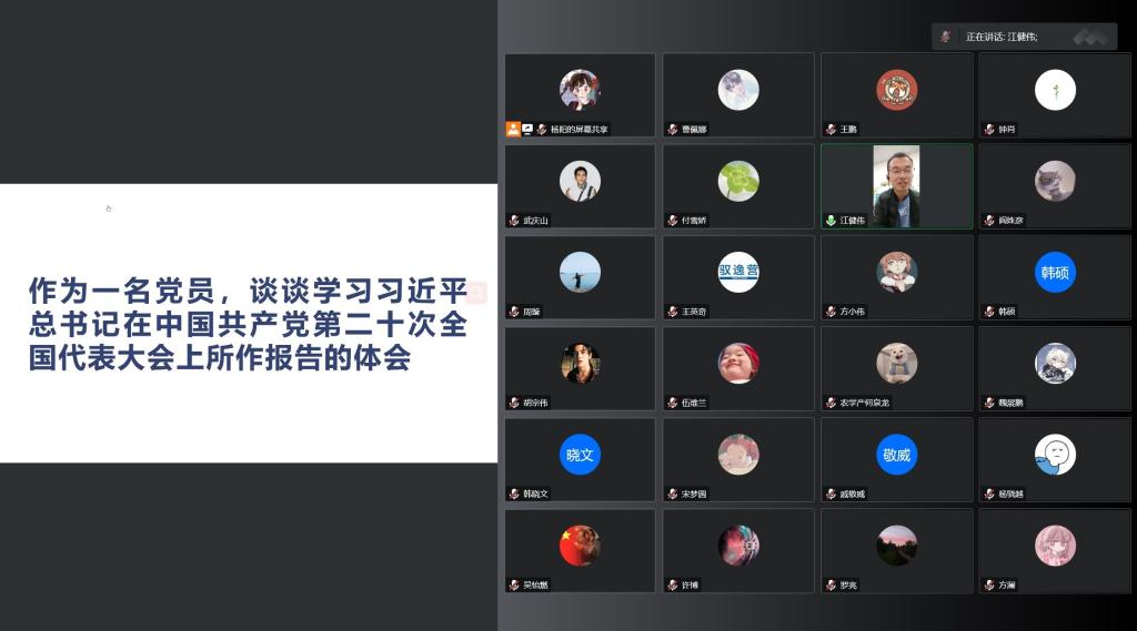 随后,全体党员以“作为一名党员,谈谈学习习近平总书记在中国共产党第二十次全国代表大会上所作的报告的体会”为主题展开研讨。大家表示,作为一名农科学生,要将自己专业所学,服务到生产实践当中;同时要勇于创新、专心科研,将自己的科研成果量化、质化,将自己的论文写在祖国的大地上,在国家的粮食安全和技术安全等方面做出贡献。