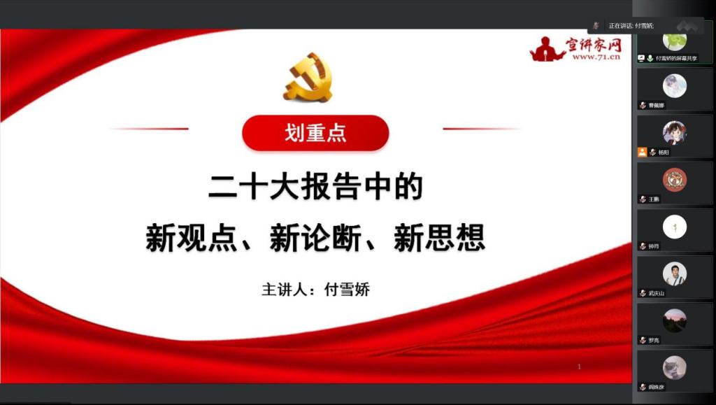 领学环节结束后,党支部书记付雪娇同志讲授党课。她结合习近平总书记在中国共产党第二十次全国代表大会上所作的报告交流了学习体会,从党的二十大报告中,讲述了党的二十大中的新观点、新论断、新思想。全体党员对党课学习做了心得体会交流,大家深刻感受到方向的指引、前进的力量和胜利的信心,在未来的新征程上,表示一定要坚定不移地坚持党的全面领导,维护党中央权威和集中统一领导,始终不渝地走中国特色社会主义道路。