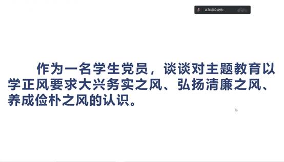 接着,全体党员以“作为一名学生党员,谈谈对主题教育以学正风要求大兴务实之风、弘扬清廉之风、养成俭朴之风的认识?”为主题展开研讨,魏喜红同志认为主题教育活动能够督促学生党员从平常生活的一点一滴做起,每位党员在日常生活中应保持俭朴的生活作风,培养健康的生活态度,牢记清廉是福,贪欲是祸的道理。通过主题教育活动,希望广大的党员同志能够从自身做起,做好学生榜样。