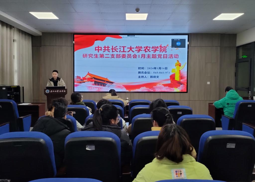 (通讯员 宋梦圆)1月16日,我院研究生第二党支部在农科大楼3073开展一月份主题党日活动,活动结合腾讯会议(ID:565 841 973)的方式同时在线上召开。全体在校党员和校外联培党员共同参与,活动由韩晓文同志主持。
