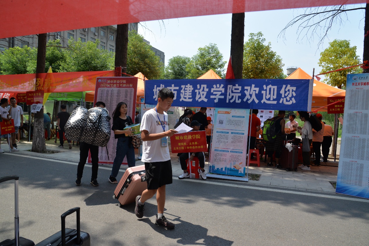迎新志愿者为新生及家长举牌示意