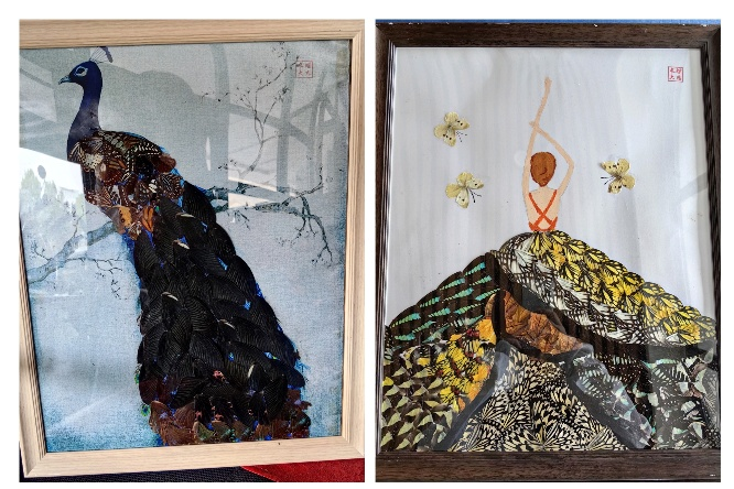 活动现场,三十幅参展作品错落陈列,每一件都尽显巧思。孔雀斑斓尾羽由深浅各异的蝶翅拼接,纹理细腻逼真;雷锋形象与相关主题字样,以哑光深色蝶翅为基底,辅以少量亮色蝶翅点缀,兼具庄重感与自然温度;“福”“寿” 字样用深褐色系蝶翅勾勒,笔触厚重;生肖形象憨态可掬,山水民居清雅别致,猫咪蓬松绒毛则通过枫叶状蝶翅剪裁呈现。最亮眼的芭蕾舞者作品,多彩蝶翅层叠铺展成灵动裙摆,周边小蝶翅模拟飞舞姿态,仿佛即将跃出画框。